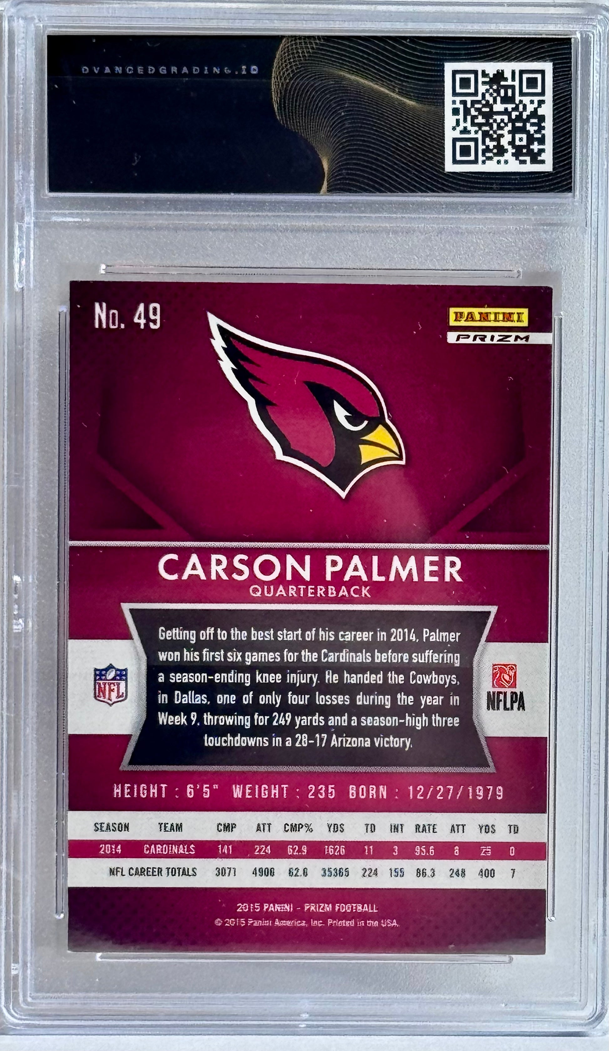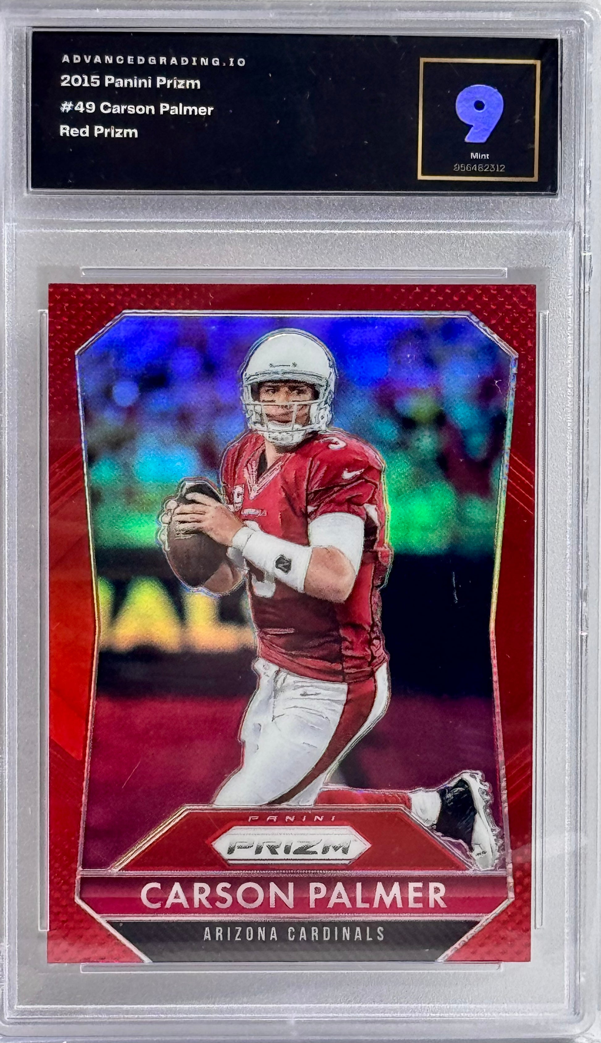 Expertly crafted 2015 Panini Prizm #49 Carson Palmer Red Prizm Mint 9 card. Featuring a pristine red prism design, this card is graded at mint condition 9. Perfect for avid collectors or fans of Carson Palmer.