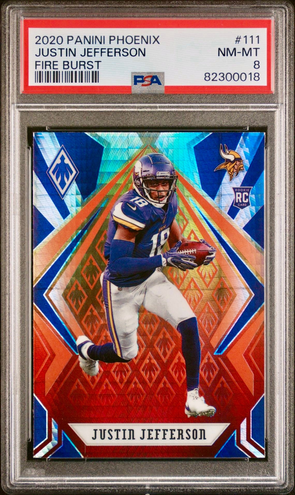 Invest in the 2020 PANINI PHOENIX JUSTIN JEFFERSON FIRE BURST PSA 8 card. This rare card features a stunning Fire Burst design, graded with a PSA 8 rating. Add this to your collection today for a unique piece of sports memorabilia.