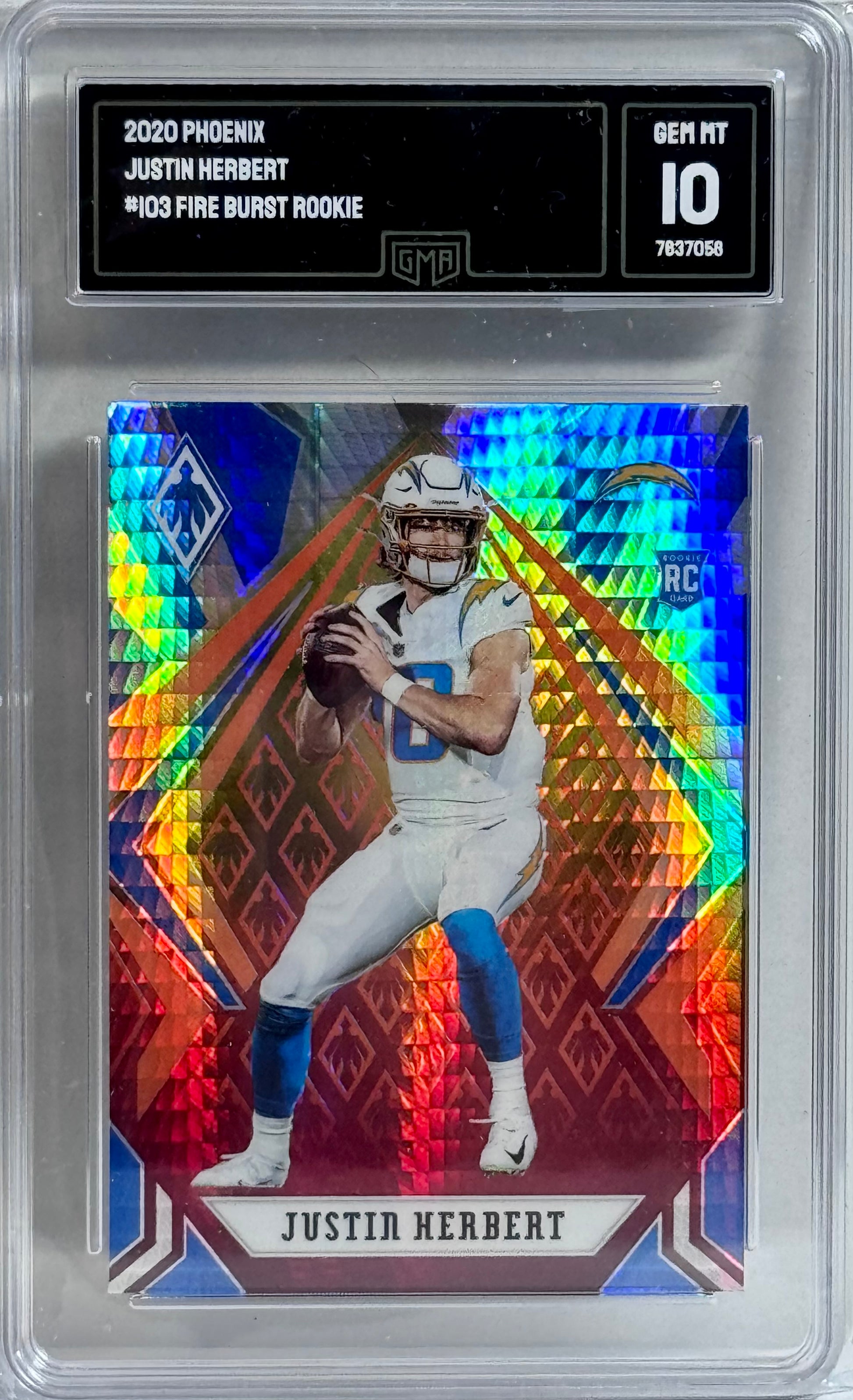 Introducing the 2020 Phoenix Justin Herbert #103 Fire Burst Rookie GMA 10 - the must-have collector's item for any football fan. This limited edition card features a stunning fire burst design and has been graded a perfect GMA 10, ensuring its value and rarity. Don't miss out on owning a piece of football history.