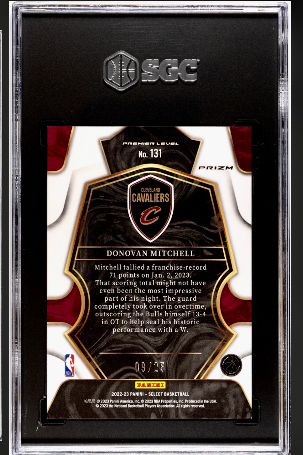 This 2022-23 PANINI SELECT card features #131 DONOVAN MITCHELL in a rare BLUE DISCO PRIZM design, numbered 9/25 and professionally graded SGC 9.5. A must-have for any basketball collector, boasting both value and quality.