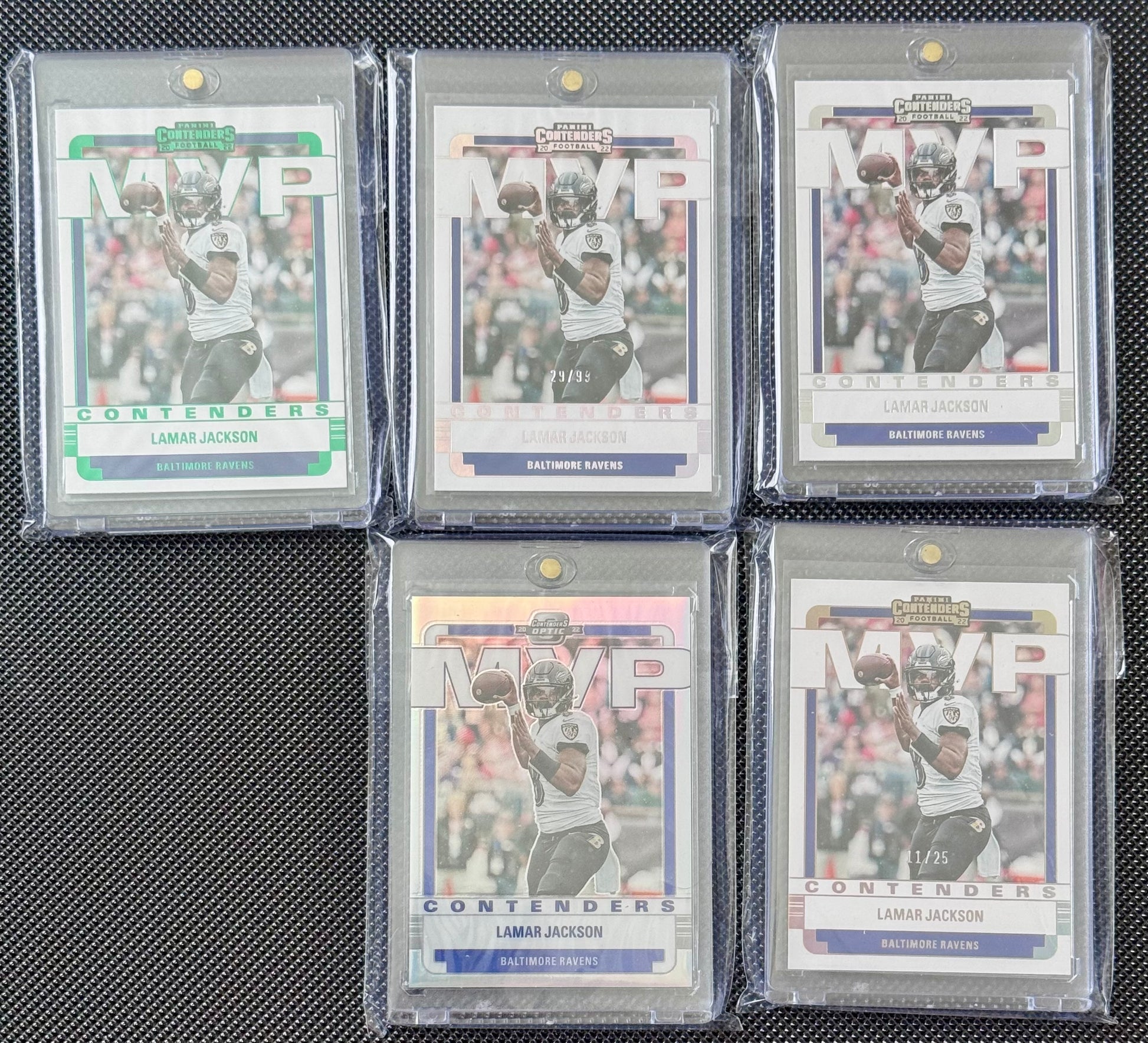 11 cards 2022 contenders optic mvp Lamar Jackson. Just missing the gold /10 /1 /13 /30 /50 /75 /99 Green /99 /25 gold Silver Base