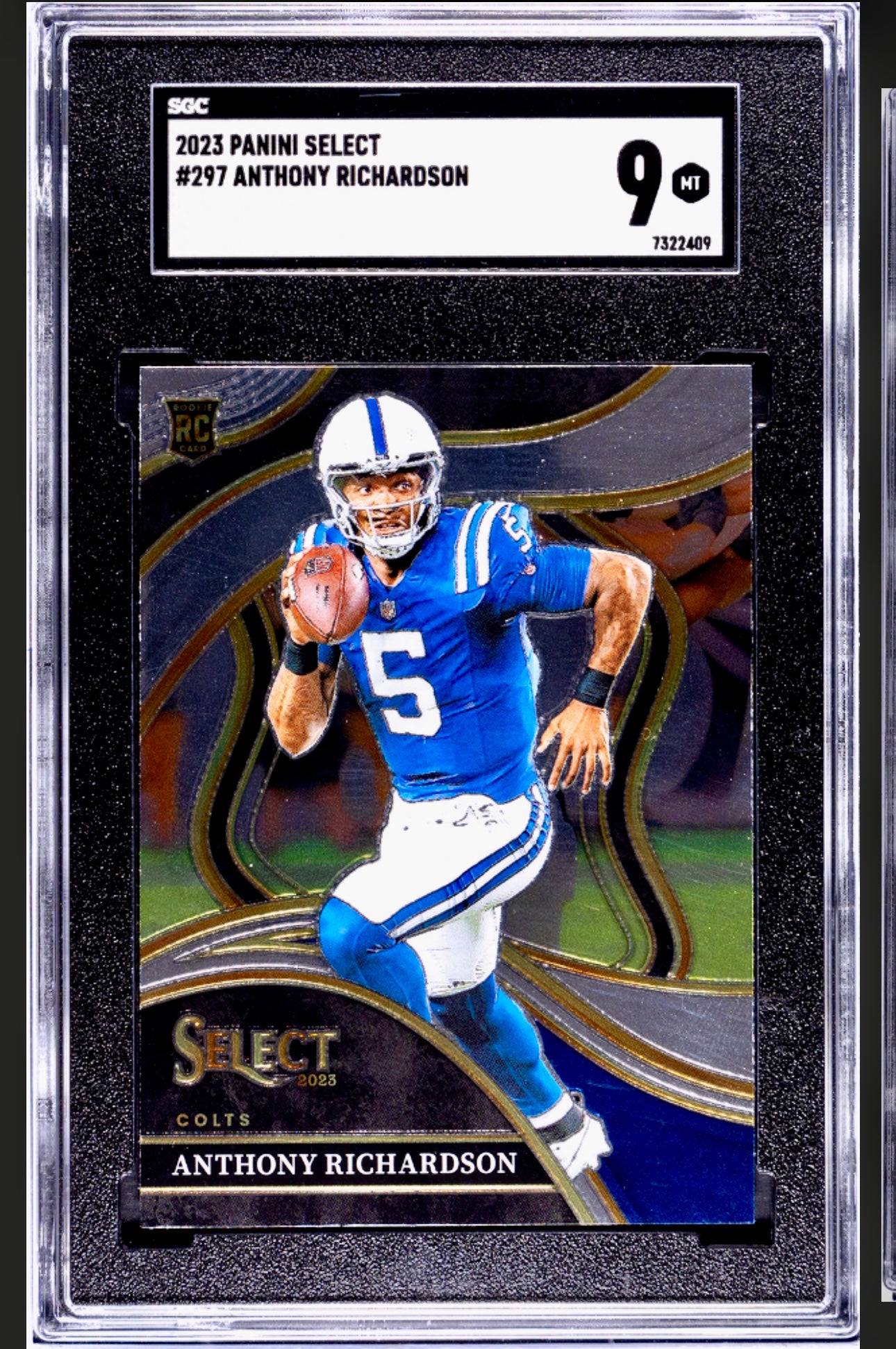 2023 Panini Select card features Anthony Richardson, graded SGC 9 for quality assurance. Invest in the future of this rising star with the best in card grading services.